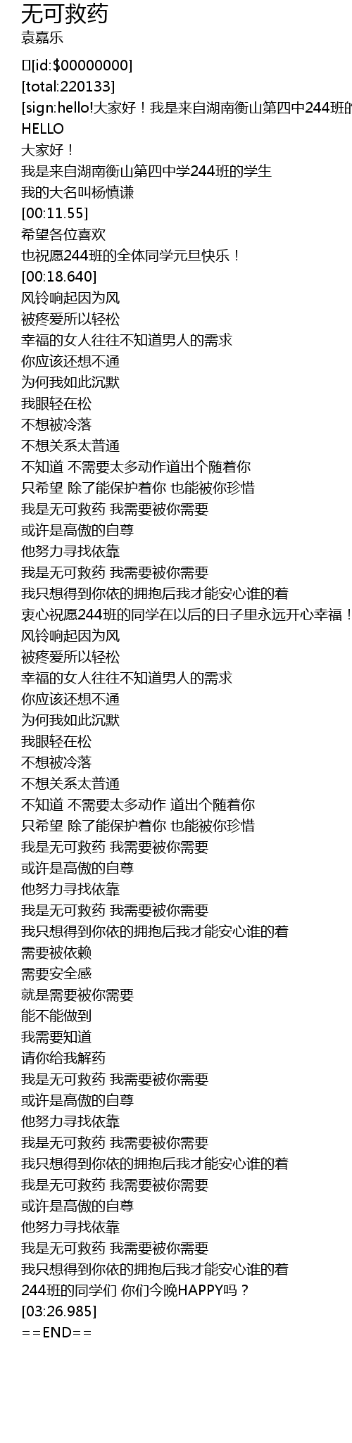 | [02:33.927] | 我是无可救药 我需要被你需要 |