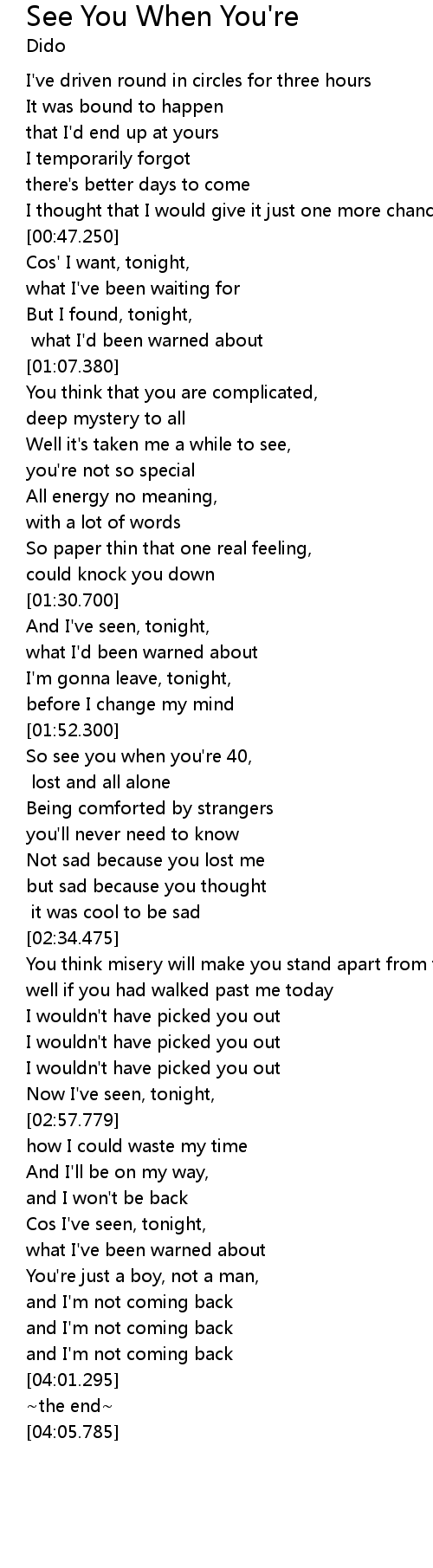 | [00:27.689] | I' ve driven round in circles for three hours |