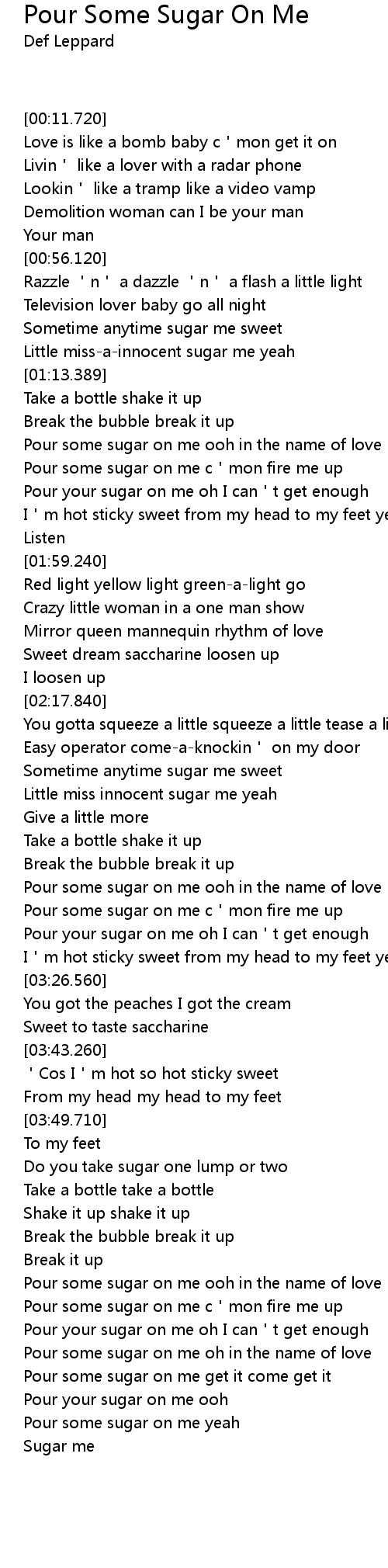 | [02:59.370] | Pour your sugar on me oh I can't get enough |