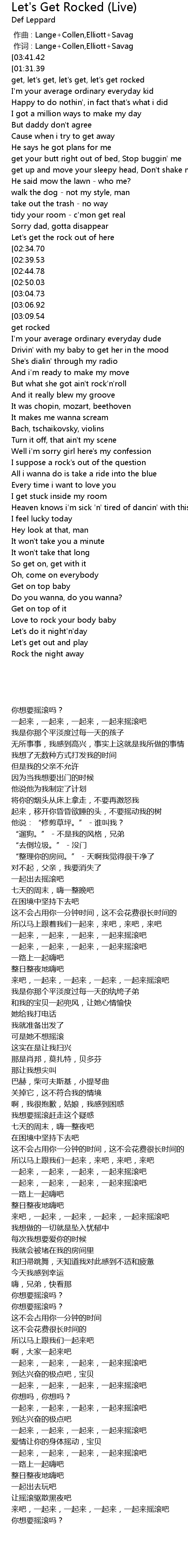 | [01:46.09][03:09.54][04:43.48] | Come on, let's get, let's get, let's get, let's get rocked |