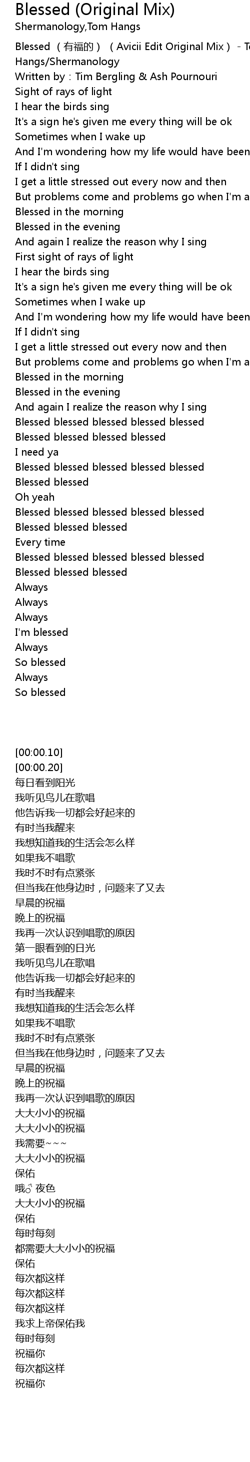| [00:00.10] | Blessed (有福的) (Avicii Edit Original Mix) - Tom Hangs/Shermanology |