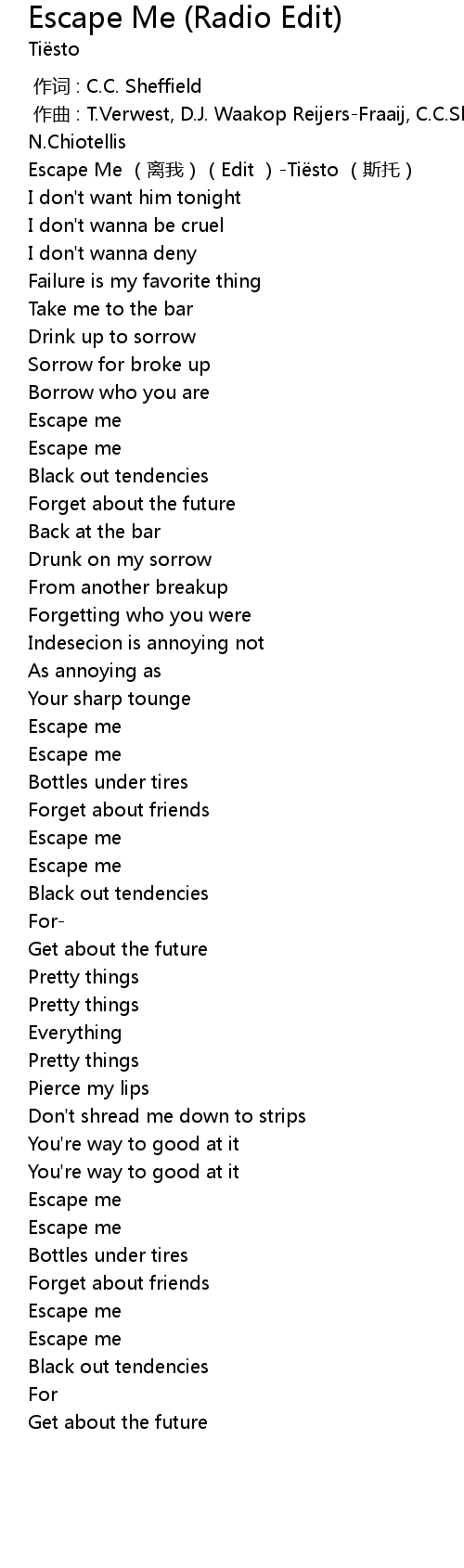| [00:00.00] | Escape Me (离我)(Edit )-Tiësto (斯托) |
