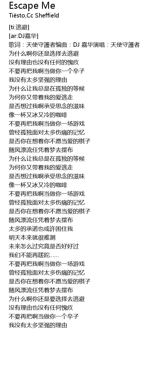 | [00:04.238] | ge ci: tian shi shou hu zhe bian qu: DJ jia hua yan chang: tian shi shou hu zhe |