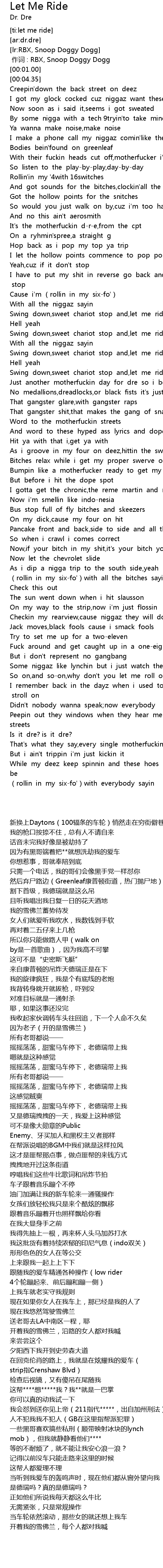 | [01:32.19] | Just another motherfuckin day for dre so i begin like this |
