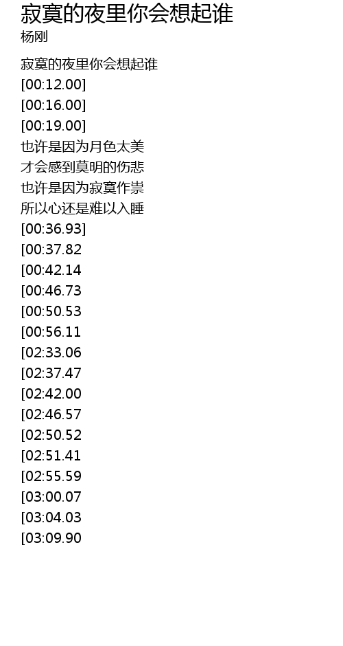 | [03:12.04][02:33.06][00:58.11] | jì mò de yè lǐ nǐ huì xiǎng qǐ shuí |
