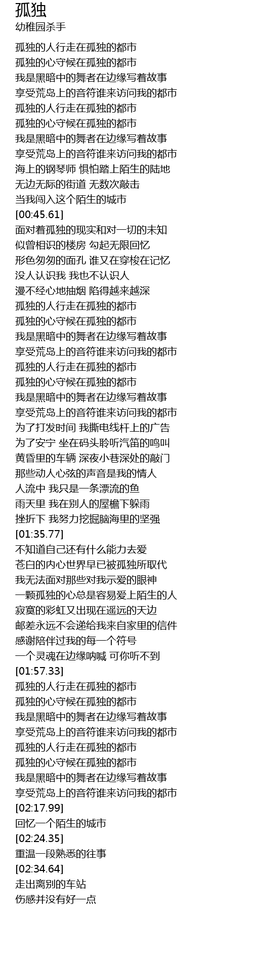 | [02:00.33] | gū dú de xīn shǒu hòu zài gū dú de dū shì |
