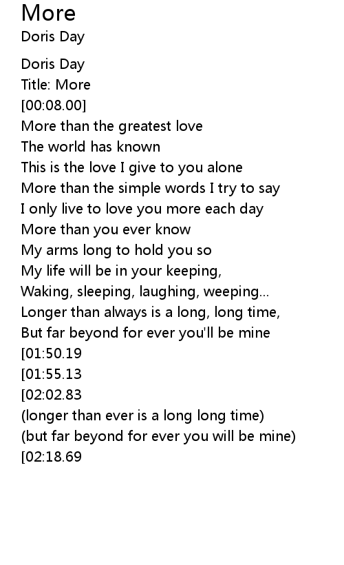 | [01:27.82][02:02.83][02:14.82][02:22.99] | No one else could love you more |