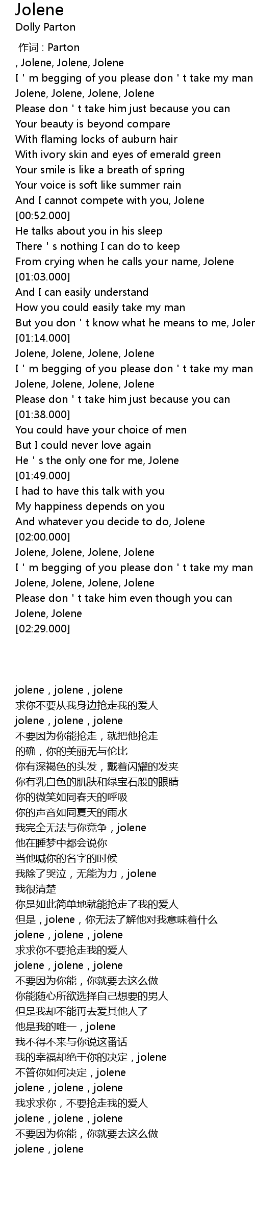 | [01:15.500] | Jolene, Jolene, Jolene, Jolene |