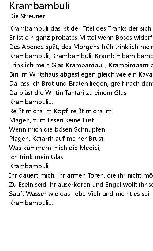 | Trink ich mein Glas Krambambuli, Krambimbam bambuli | |
