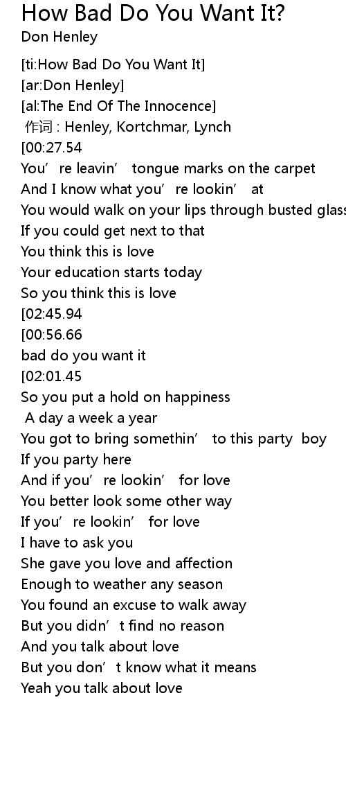 | [00:53.73][00:56.66][01:01.79][01:50.70][01:54.51][01:58.57][02:47.18][02:51.11][02:55.10] | How bad do you want it |