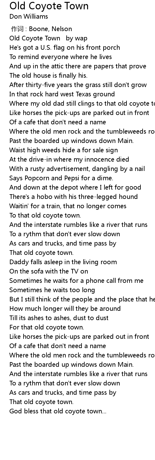 | [00:50.00] | Where my old dad still clings to that old coyote town. |