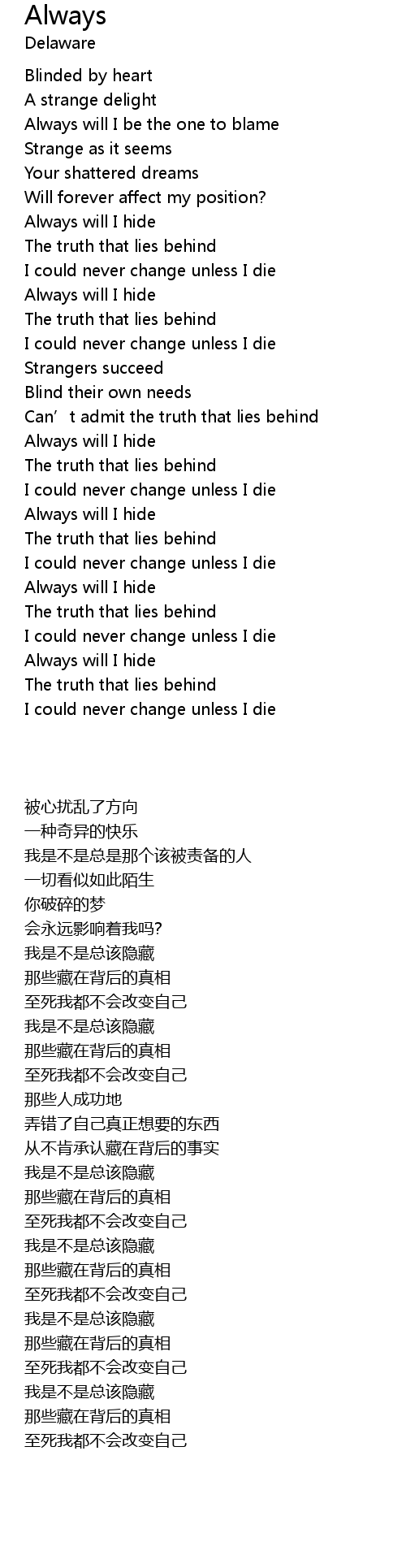 | [01:36.65] | Can’t admit the truth that lies behind |