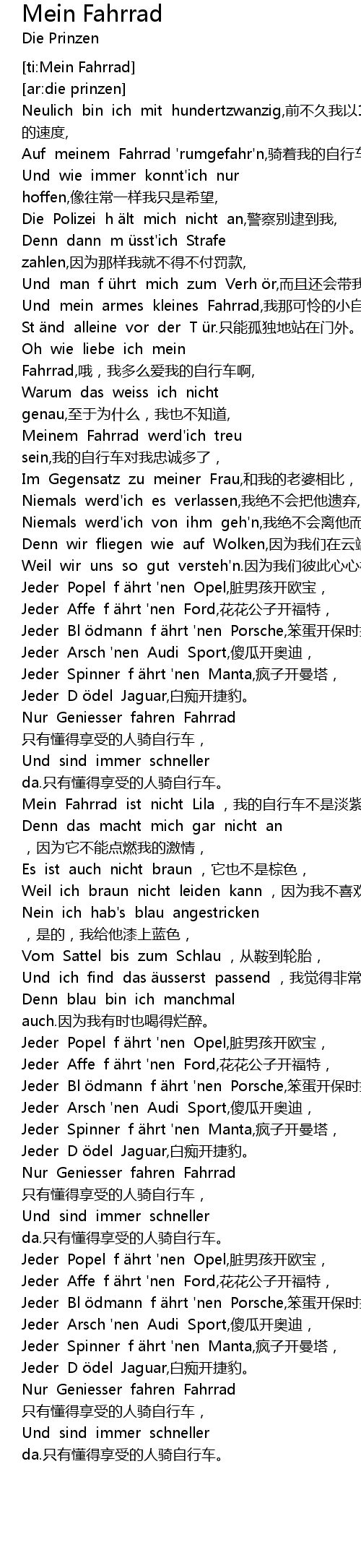 | [00:23.767] | Oh wie liebe ich mein Fahrrad,哦,我多么爱我的自行车啊, |