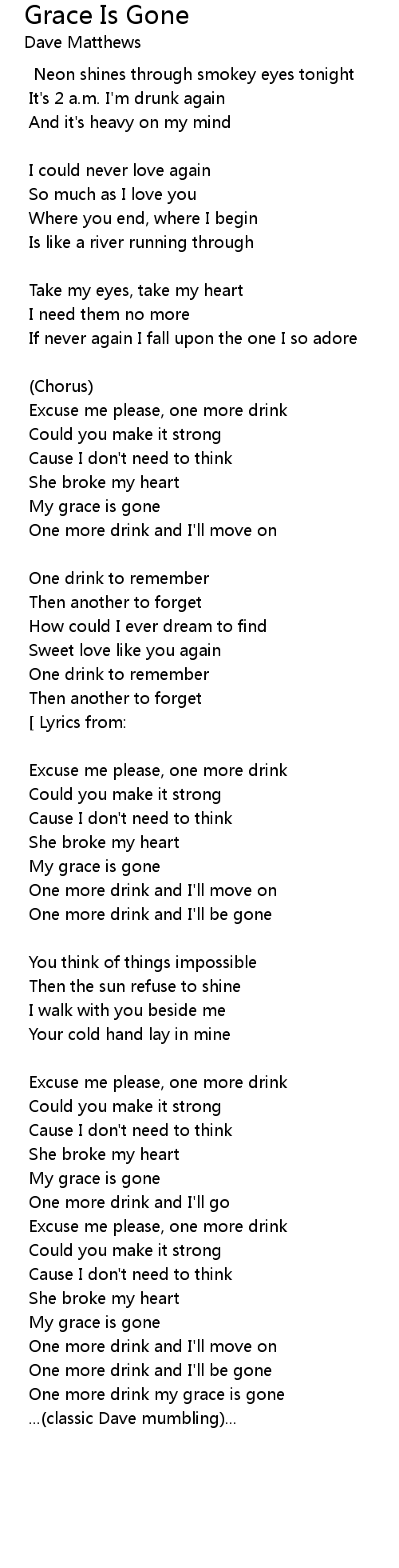 [ Lyrics from: http://www.lyricsfreak.com/d/dave+matthews+band/grace+is+gone_20036641.html ] |