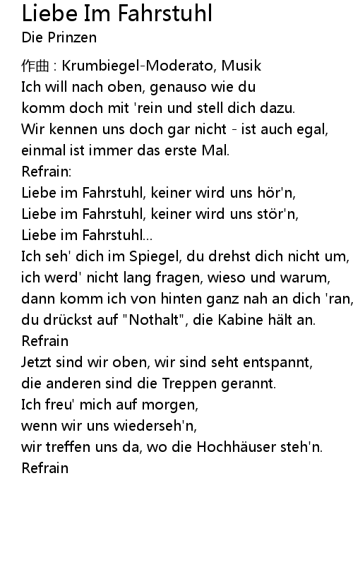 | Liebe im Fahrstuhl, keiner wird uns st r' n, | |