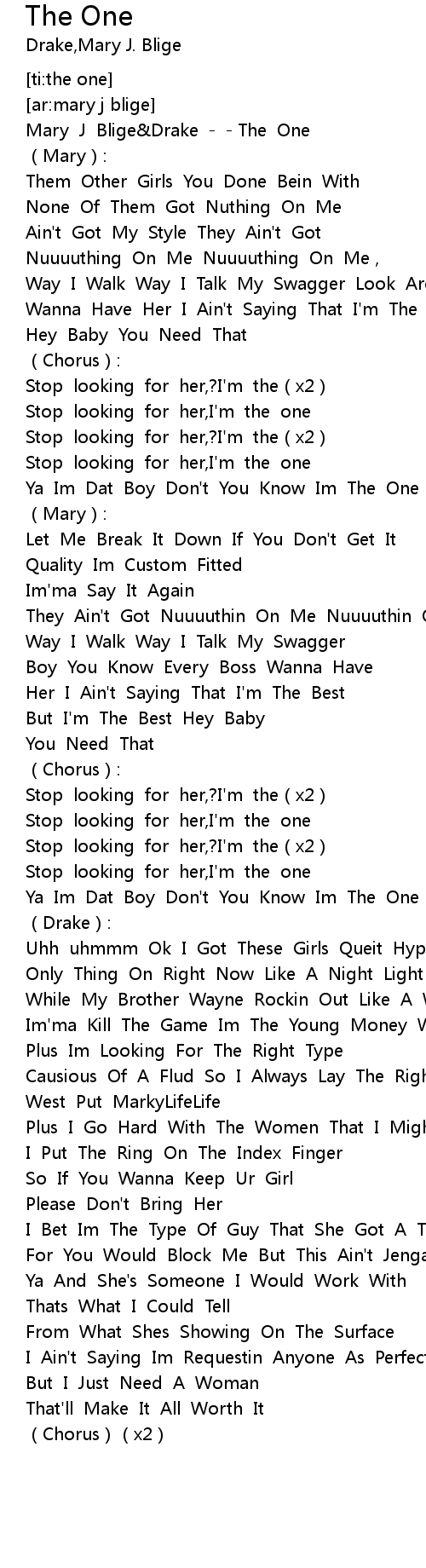| [00:04.54] | Mary J Blige&Drake --The One |