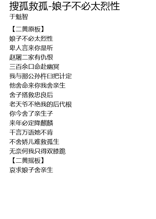 | Song | 搜孤救孤-娘子不必太烈性 |