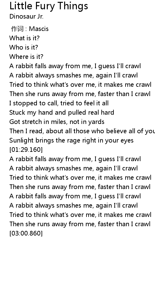 | [02:29.900] | A rabbit falls away from me, I guess I'll crawl |