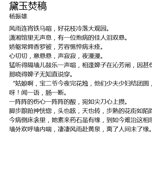 | 脚步踉跄神恍惚,头也眩,天也转,步熟的花街如陌路般,幸得知心婢紫娟,相扶同返潇湘馆,呛血连连泪涓涓,开箱取出香罗帕,将火盆移近奴身畔,旧帕新诗火中燃,化作飞灰一炬完。而 | |