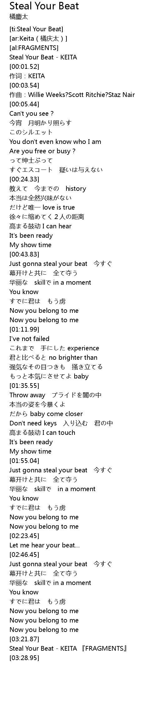 | [03:24.06] | Steal Your Beat KEITA FRAGMENTS |