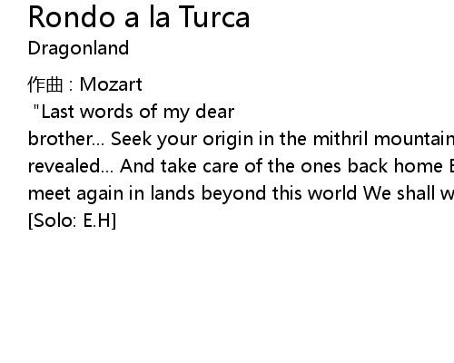 | Music: Wolgang Amadeus Mozart , Arranged by Dragonland " Last words of my dear brother... Seek your origin in the mithril mountain All answers shall be revealed... And take care of the ones back home Before it' s too late... We' ll meet again in lands beyond this world We shall walk the silver fields again..." Solo: E. H |