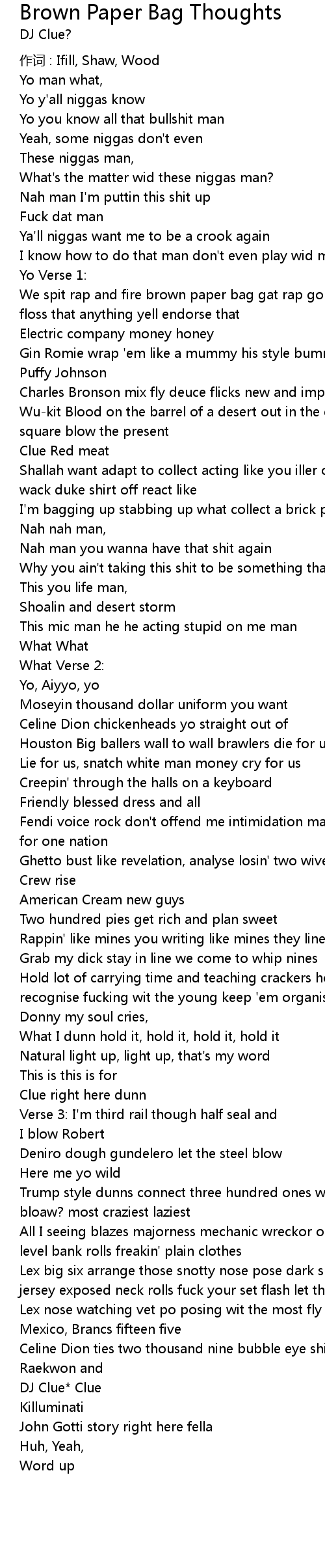 | We spit rap and fire brown paper bag gat rap go whack and float acrooss the map floss that anything yell endorse that | |