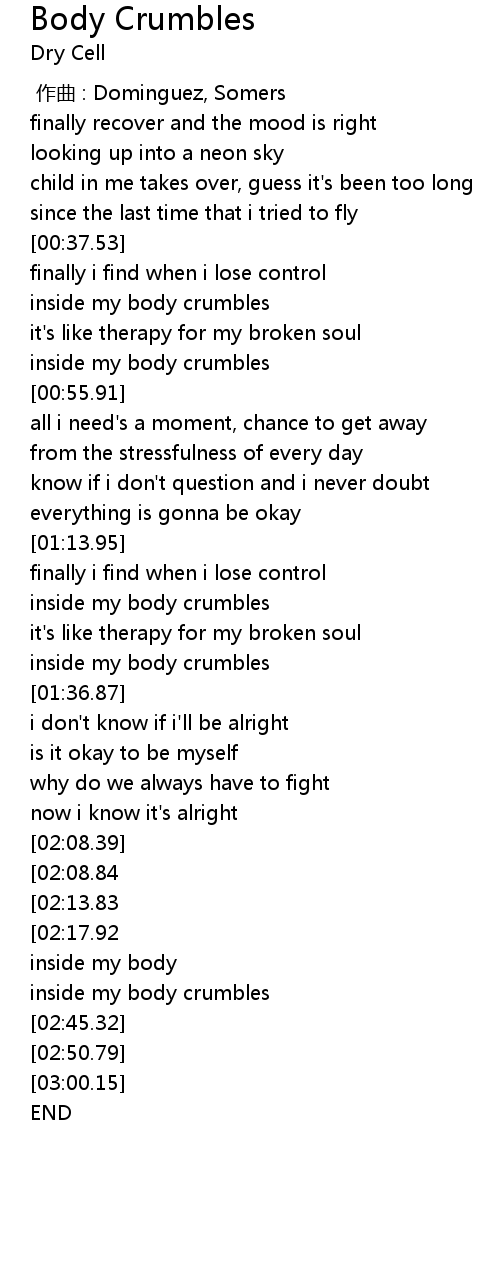 | [02:32.04][02:13.83] | inside my body crumbles |