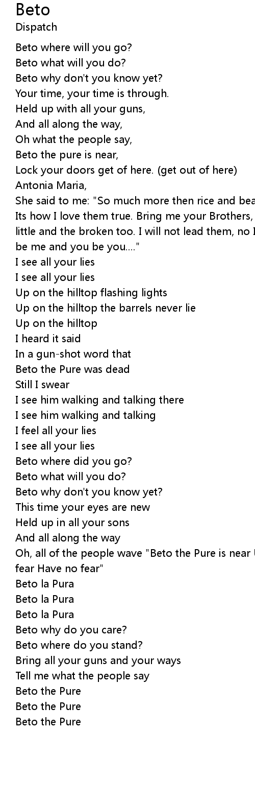 | Oh, all of the people wave "Beto the Pure is near Unlock your doors and have no fear Have no fear" | |