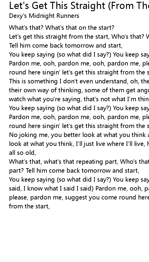You keep saying (so what did I say?) You keep saying (Go on, tell me what I said, I know what I said I said) Pardon me, ooh, pardon me, ooh, pardon me, please, pardon me, suggest you come round here singin' let's get this straight from the start,