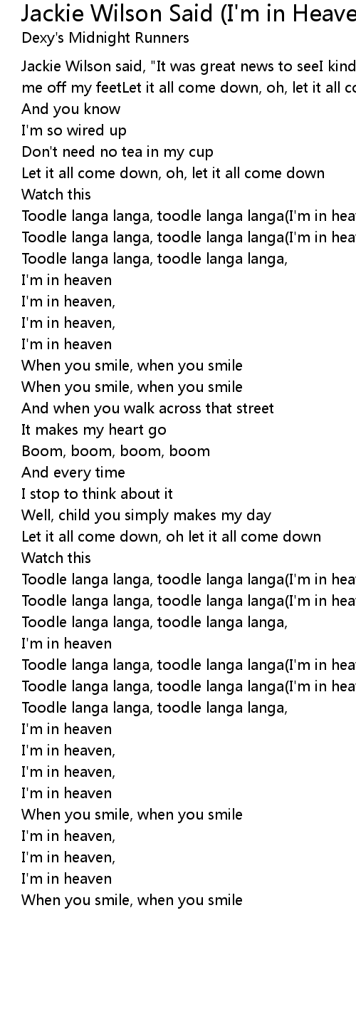 Jackie Wilson said, "It was great news to seeI kind of love you, babyIt knocks me off my feetLet it all come down, oh, let it all come down" |