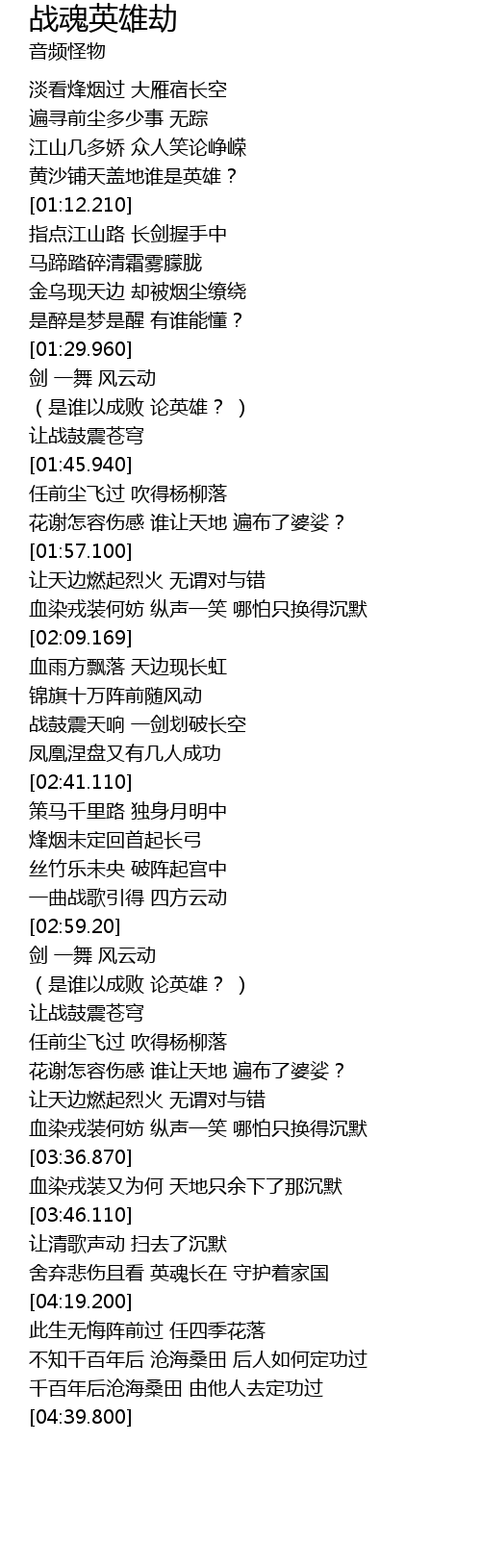 | [04:14.840] | 舍弃悲伤且看 英魂长在 守护着家国 |