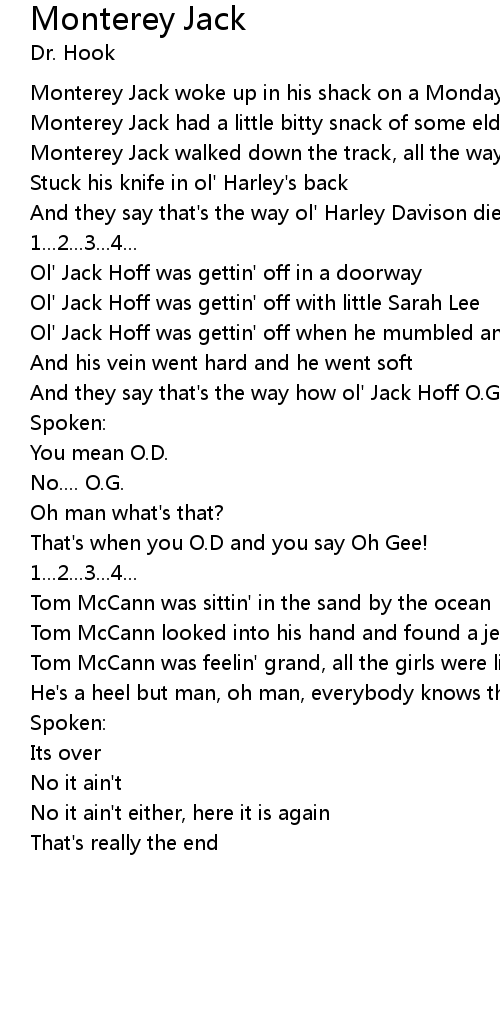 Monterey Jack walked down the track, all the way to ol' Harley's shack |