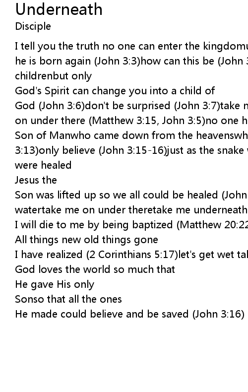 God (John 3:6)don't be surprised (John 3:7)take me underneath the watertake me on under there (Matthew 3:15, John 3:5)no one has gone up except the