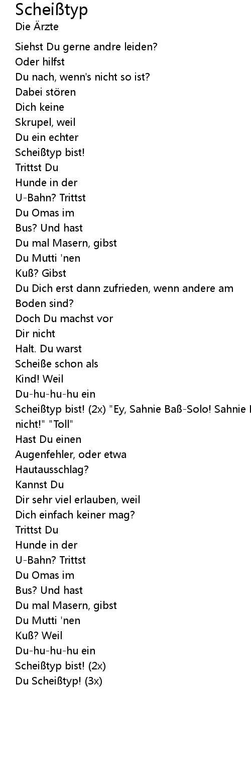 | Scheißtyp bist! (2x) "Ey, Sahnie Baß-Solo! Sahnie Baß-Solo!" "Ich trau mich nicht!" "Toll" | |