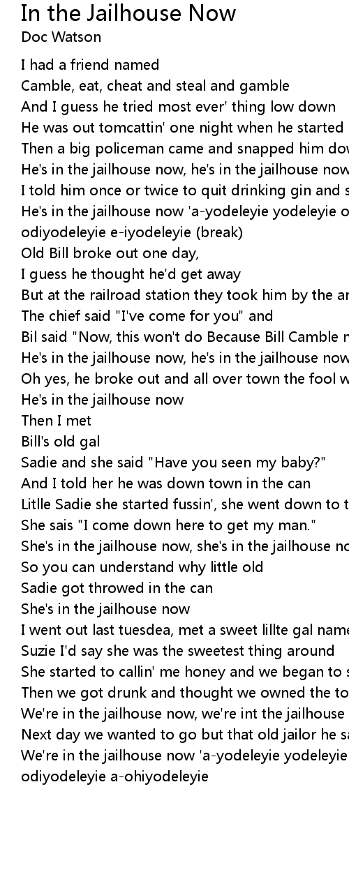 He's in the jailhouse now 'a-yodeleyie yodeleyie oh-ohoohdeleyie 'a-yodeleyie odiyodeleyie e-iyodeleyie (break)