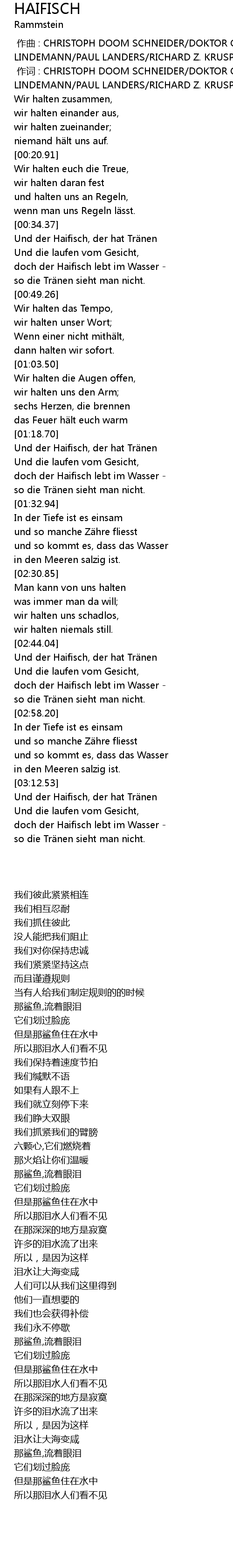 | [00:34.59] | Und der Haifisch, der hat Tränen |