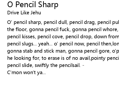 O' pencil sharp, pencil dull, pencil drag, pencil pull, gonna pencil pokeya' to the floor, gonna pencil fuck, gonna pencil whore, o' pencil vuture,pencil dove, pencil kisses, pencil cove, pencil drop, down from abovespittin' pencil bullets pencil slugs... yeah... o' pencil now, pencil then,long before ya had a pen, gonna stab and stick man, gonna pencil gore, o'pencil get the response, the one he looking for, to erase is of no avail,pointy pencil will prevail, slippery the pencil slide, swiftly the pencilsail. -