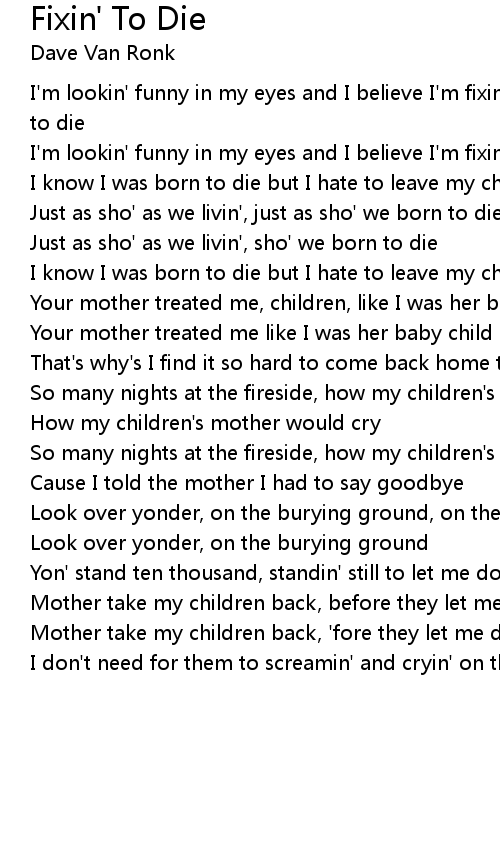 I'm lookin' funny in my eyes and I believe I'm fixin' to die, believe I'm fixin' to die |