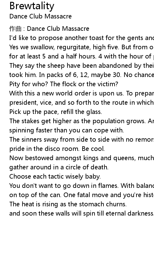 | The sinners sway from side to side with no remorse. The virgins marry us with pride in the disco room. Be cool. | |
