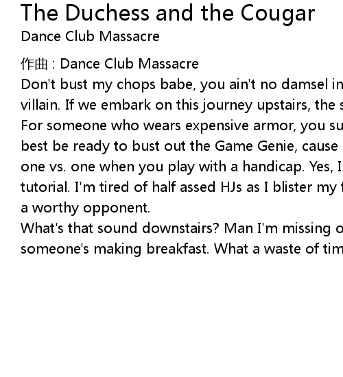 | For someone who wears expensive armor, you sure as hell can' t hold your own. You best be ready to bust out the Game Genie, cause I' m the final boss. I' m tired of one vs. one when you play with a handicap. Yes, I rock, but you sure could use a tutorial. I' m tired of half assed HJs as I blister my fingers. No, I won' t find a worthy opponent. | |