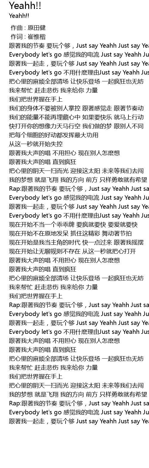 | [00:17.80] | 跟著我一起走,要玩个够 Just say Yeahh Just say Yeahh |