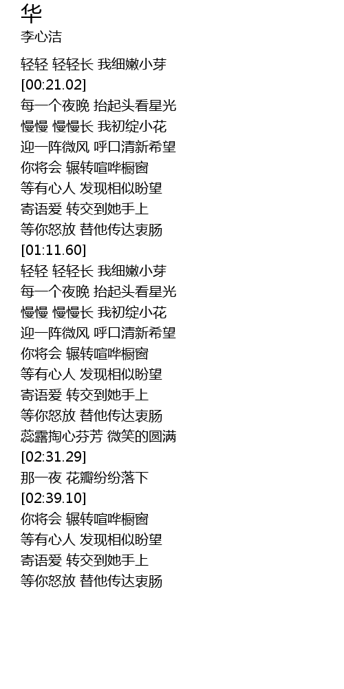 | [00:28.92] | 慢慢 慢慢长 我初绽小花 |