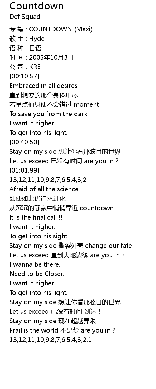 | [00:08.35] | 专 辑 : COUNTDOWN (Maxi) |