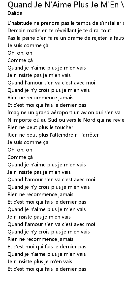 | Song | Quand Je N'Aime Plus Je M'En Vais |