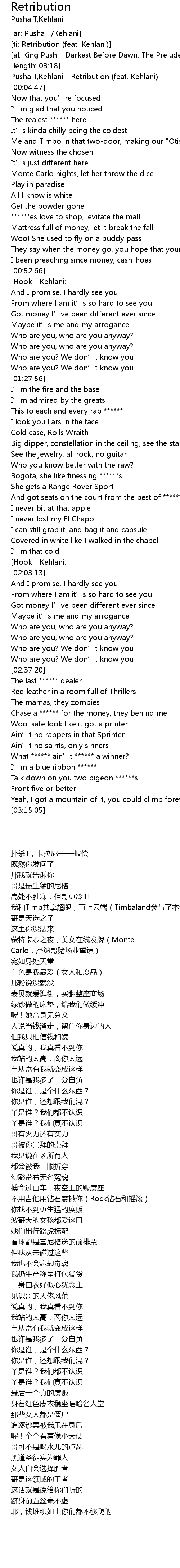 | [00:00.78] | Pusha T, Kehlani Retribution feat. Kehlani |