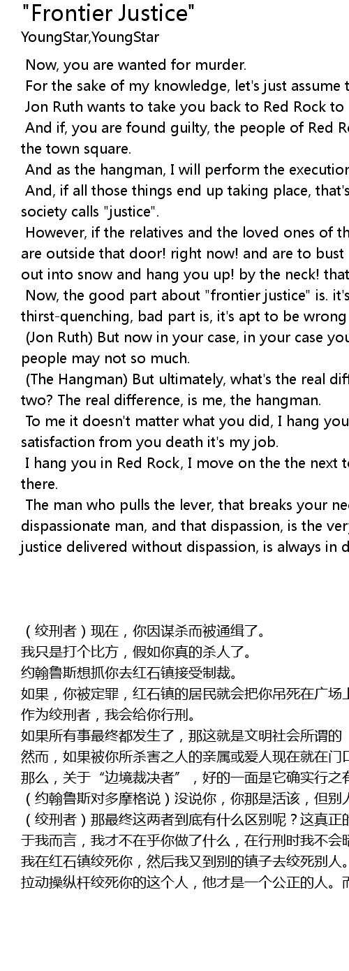 | [00:34] | However, if the relatives and the loved ones of the person you murdered are outside that door! right now! and are to bust down that door! they drag you out into snow and hang you up! by the neck! that, would be "frontier justice". |