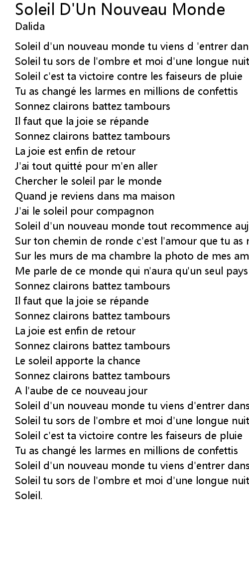 | Soleil d' un nouveau monde tu viens d ' entrer dans ma vie | |