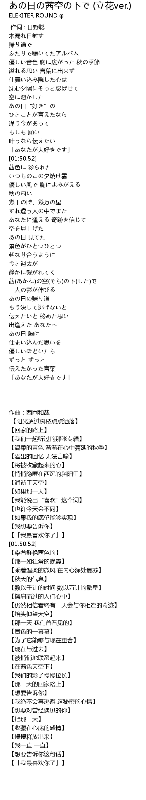 | [03:20.38] | 茜(あかね)の空(そら)の下(した)で |