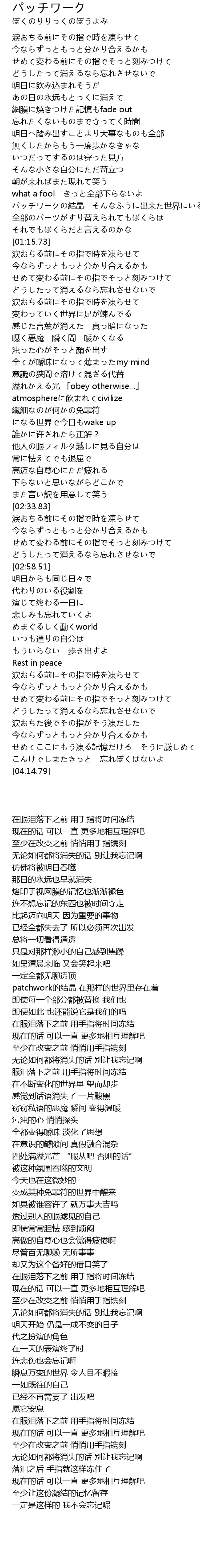 | [01:04.58] | パッチワークの結晶 そんなふうに出来た世界にいるの |