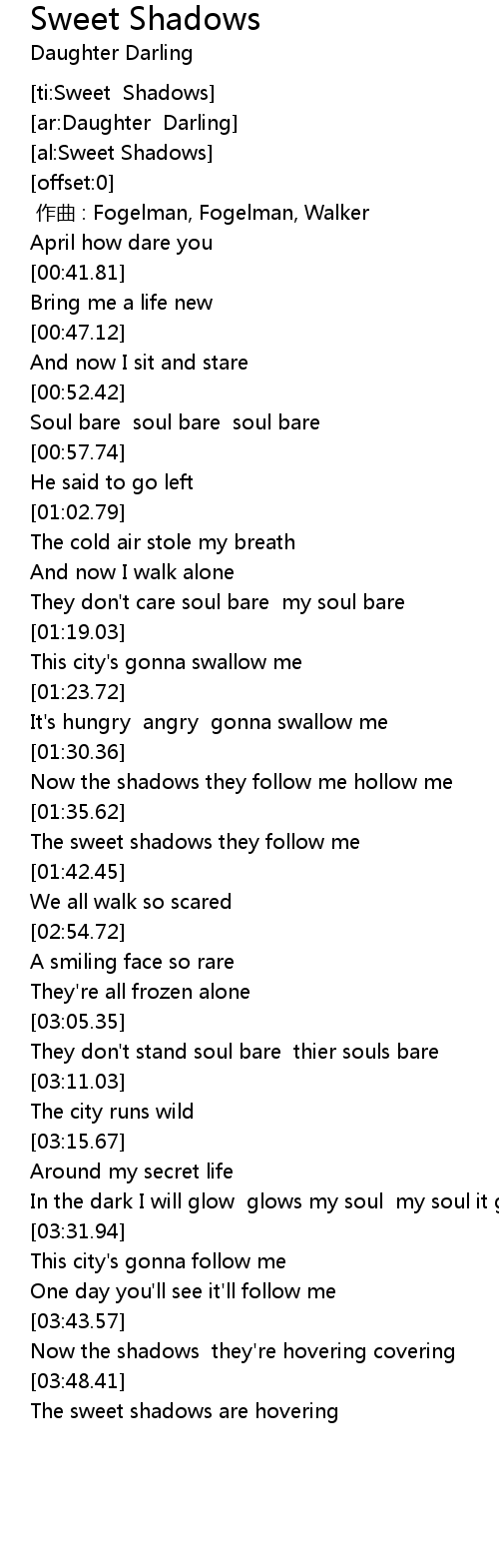 | [01:36.13] | The sweet shadows they follow me |